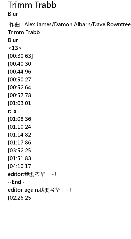 | [00:00.00] | zuo qu : Alex James Damon Albarn Dave Rowntree Graham Coxon |