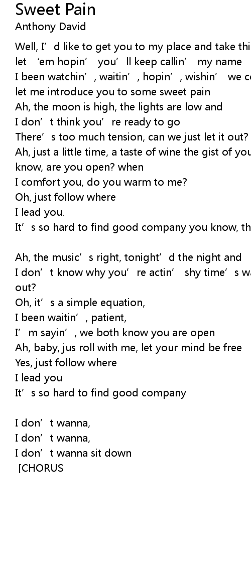| I been watchin’, waitin’, hopin’, wishin’ we could get it on together let me introduce you to some sweet pain | |