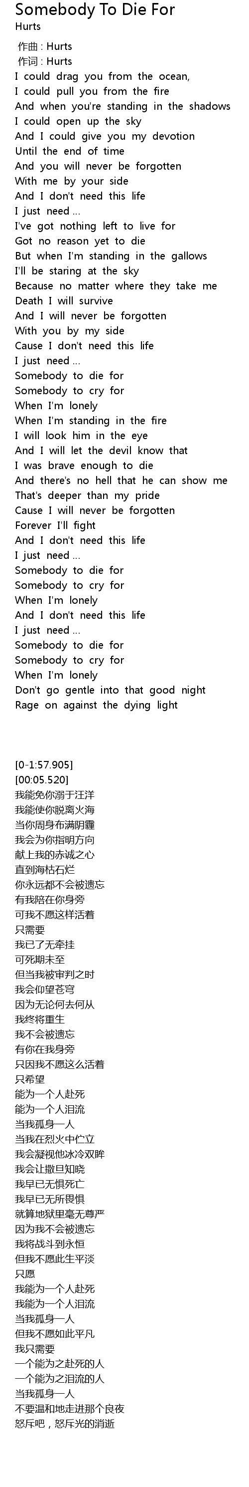 | [00:01.00] | 作词 : Hurts |