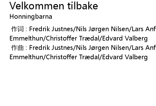 | [00:00.000] | 作词 : Fredrik Justnes/Nils Jørgen Nilsen/Lars Anfrido Emmelthun/Christoffer Trædal/Edvard Valberg |