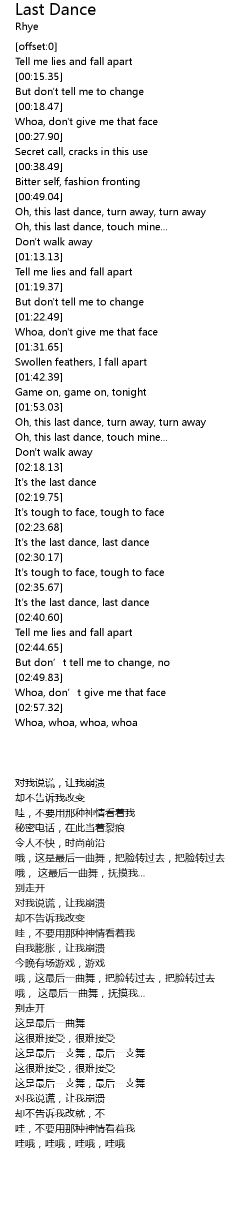 | [00:57.40] | Oh, this last dance, turn away, turn away |