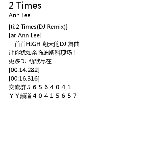 | [00:00.718] | yī shǒu shǒu HIGH fān tiān de DJ wǔ qǔ |