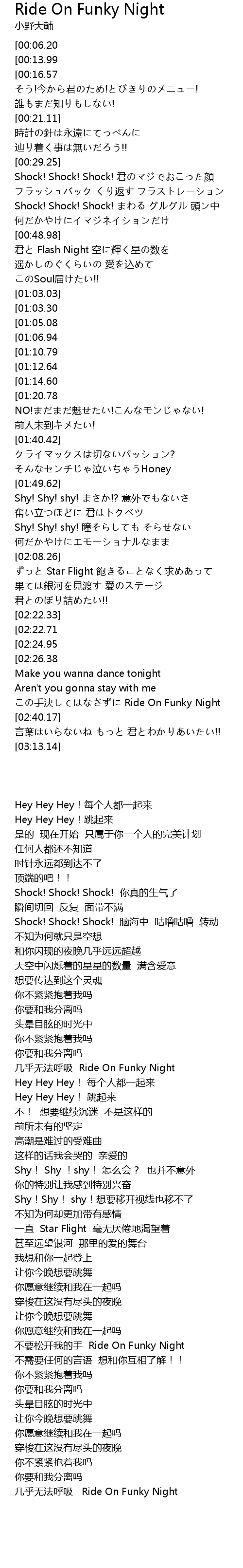| [03:33.98][01:14.60] | xī chū lái Ride On Funky Night |