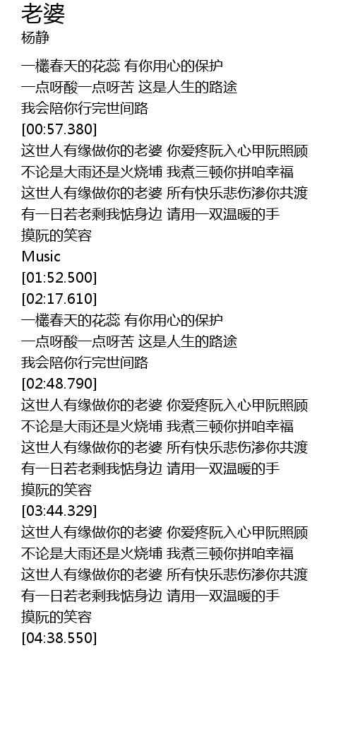 | [02:50.410] | 这世人有缘做你的老婆 你爱疼阮入心甲阮照顾 |