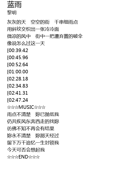 | [02:57.84][02:28.18][01:09.27] | 冷冷雨 Wo... 没焦点因找不到妳 |