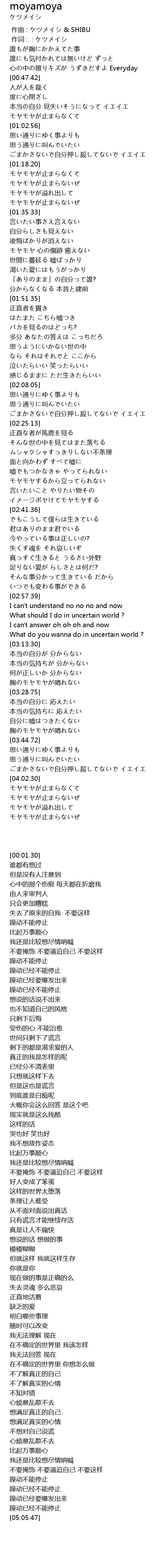 | [01:30.73] | モヤモヤが止まらないぜ |