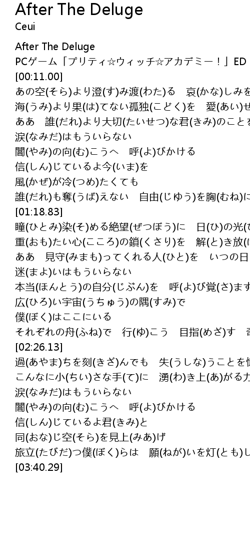 | [00:18.62] | あの空(そら)より澄(す)み渡(わた)る 哀(かな)しみを溶(と)かしてください |