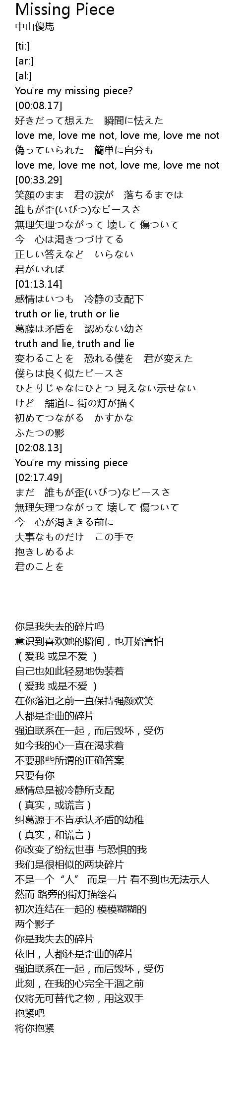 | [02:14.94] | You're my missing piece |
