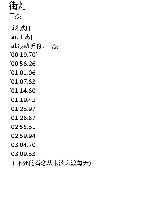| [03:29.22][02:59.94][01:38.12] | 街灯可见证 这对我对你最思念 |
