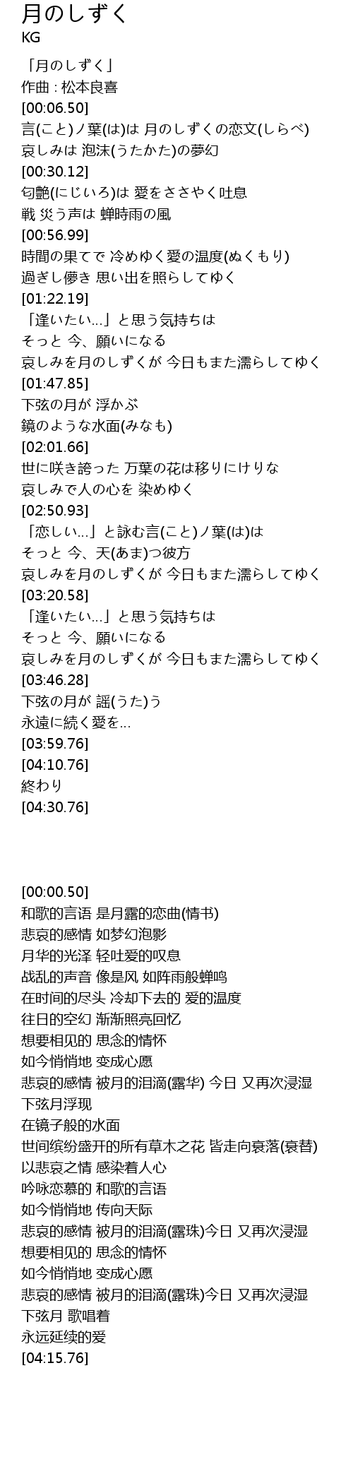 | [00:07.50] | 言(こと)ノ葉(は)は 月のしずくの恋文(しらべ) |