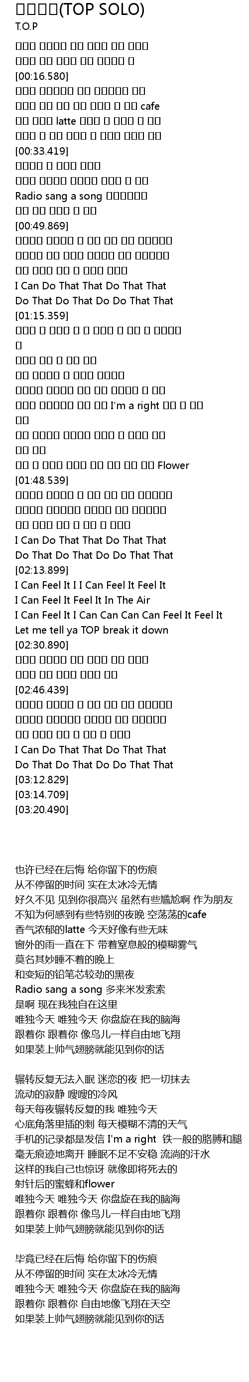 | [01:36.270] | 휴대폰 통화기록은 죄다 발신 I'm a right 무쇠 팔 무쇠 다리 |
