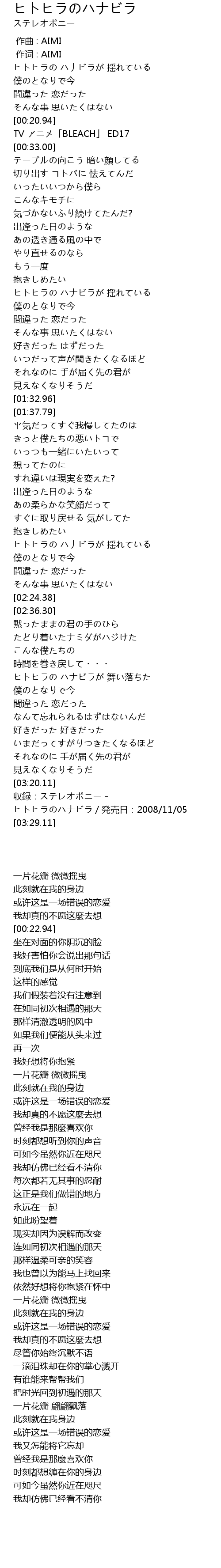 | [03:22.11] | 収録:ステレオポニー - ヒトヒラのハナビラ/発売日:2008/11/05 |