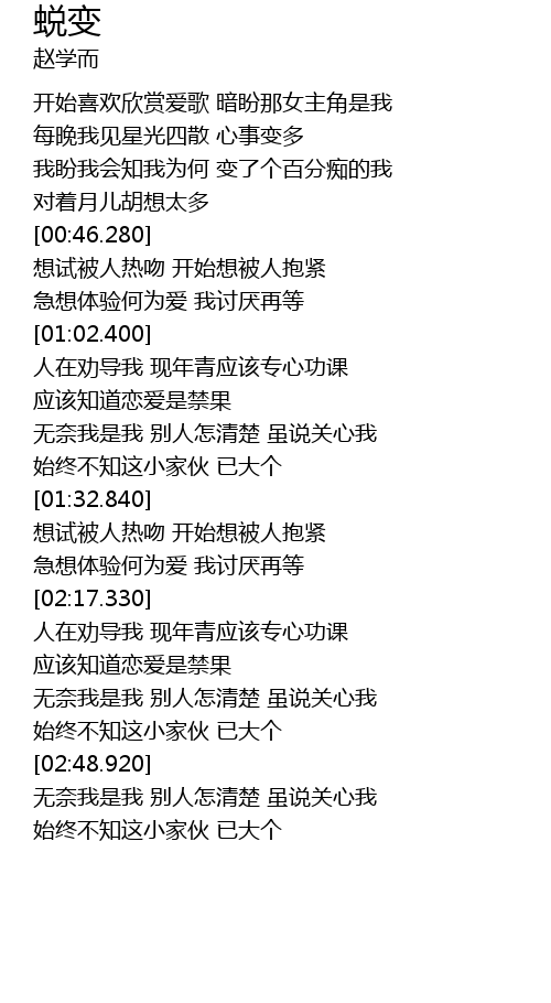 | [00:47.070] | 想试被人热吻 开始想被人抱紧 |
