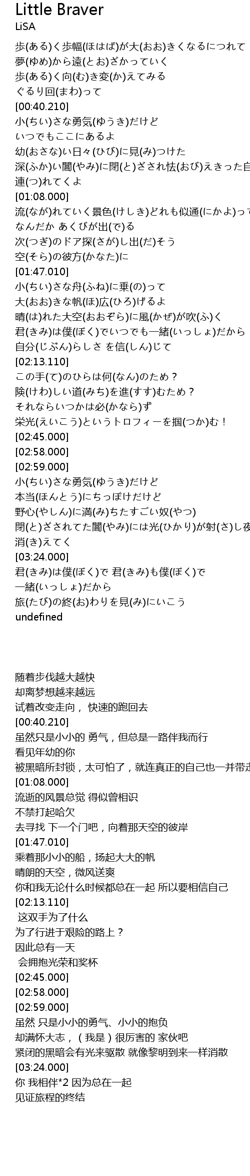 | [00:41.440] | 小(ちい)さな勇気(ゆうき)だけど いつでもここにあるよ |