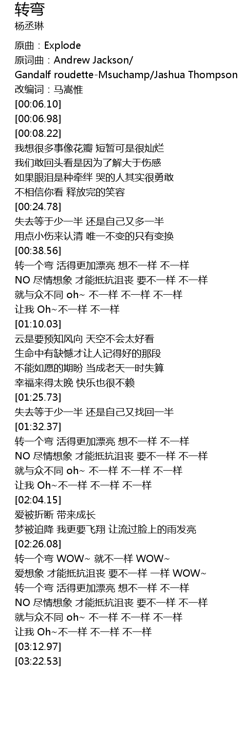 | [02:41.93] | 转一个弯 活得更加漂亮 想不一样 不一样 |