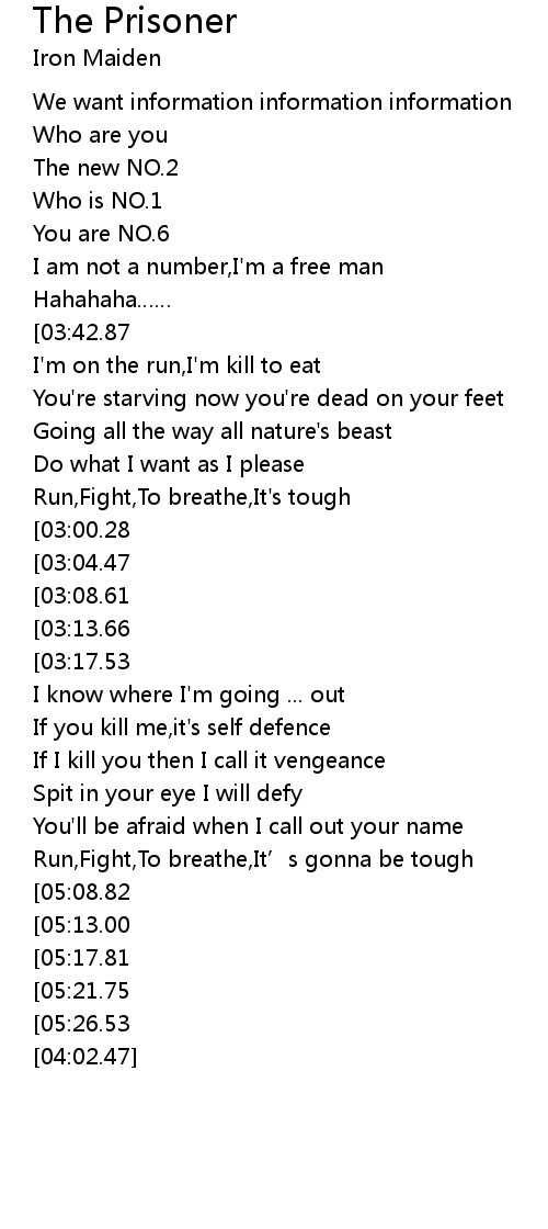 | [03:26.99][05:13.00] | I' m not a number I' m a free man |