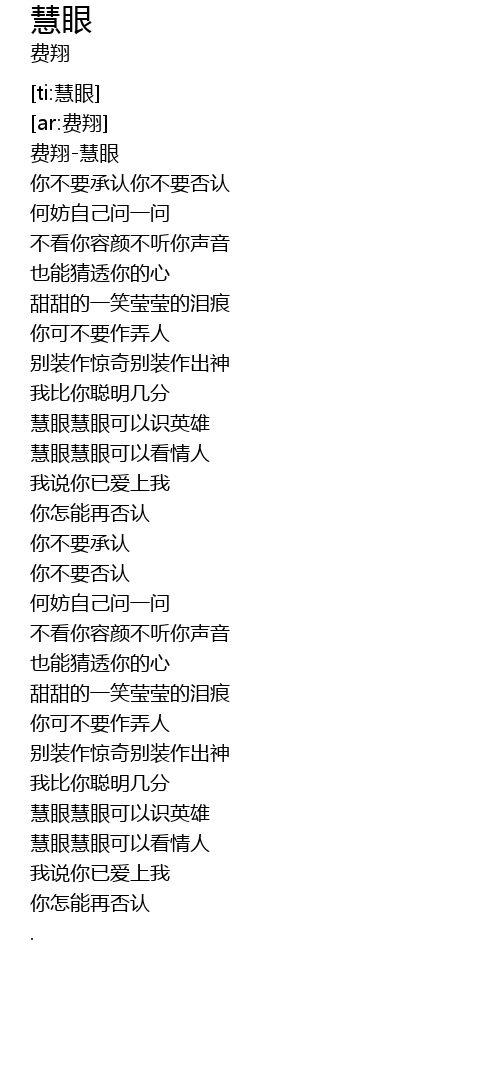 | [00:01.23] | 费翔-慧眼 |