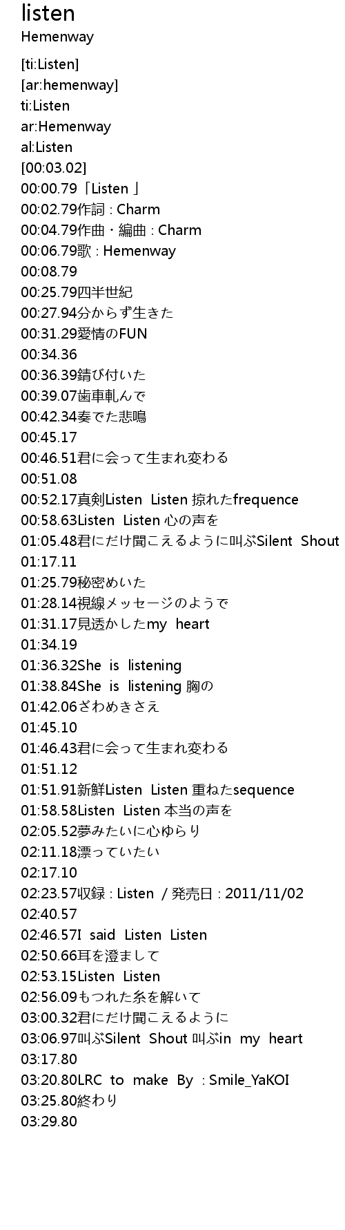 | [02:16.23] | 02:23.57収録∶Listen /発売日∶2011/11/02 |