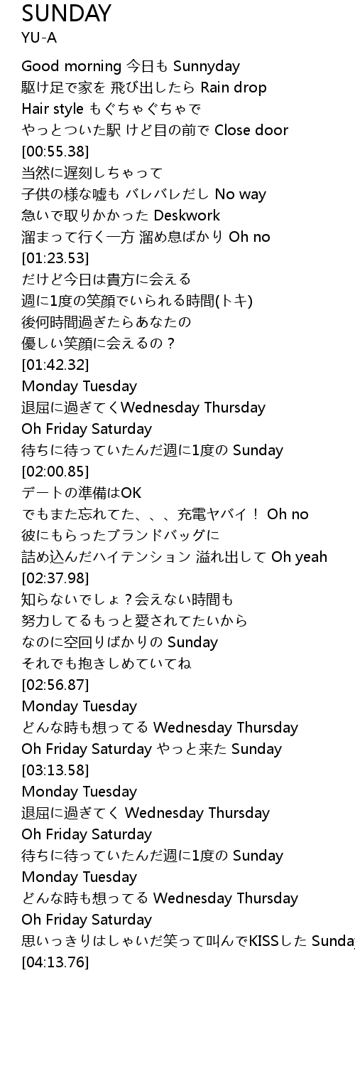 | [01:56.54] | 待ちに待っていたんだ週に1度の Sunday |