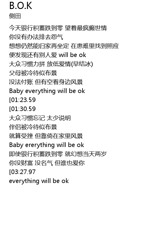 | [03:31.42][03:27.97][03:24.50][03:17.77][03:14.23][03:10.39][03:03.68][03:00.30][02:56.58] | Everything everything will be ok |