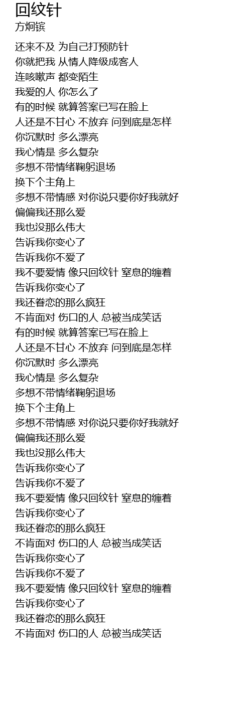 | [01:48.999] | 我不要爱情 像只回纹针 窒息的缠着 |