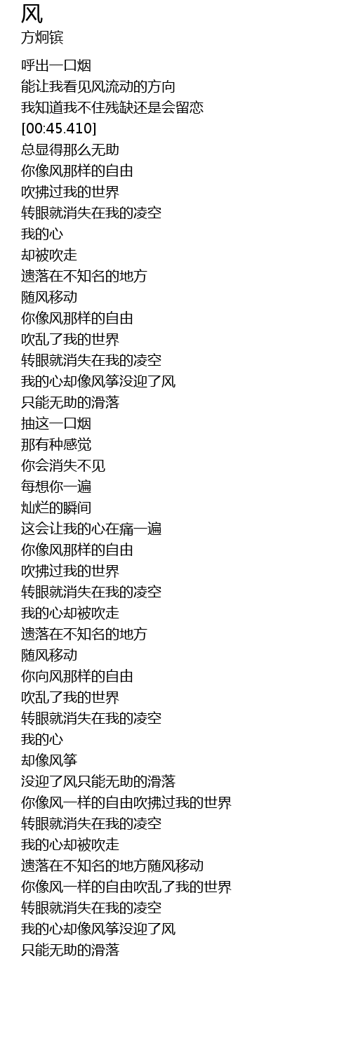 | [04:15.480] | 我的心却像风筝没迎了风 |