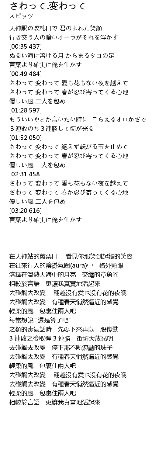 | [02:56.041] | さわって 変わって 春が忍び寄ってくる心地 |