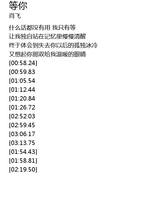| [03:19.59][02:52.03][01:27.07] | 我等你等到永久等到泪流等到你点头 |