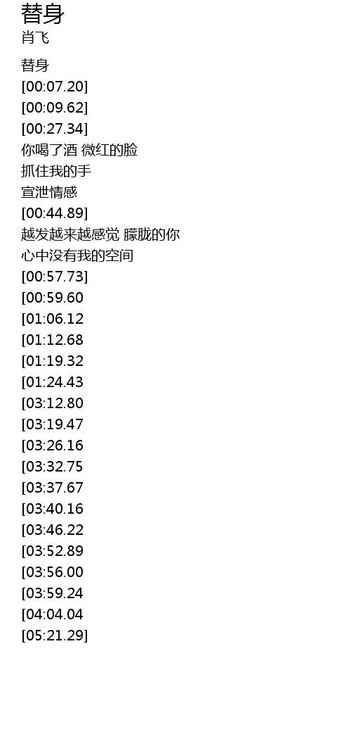 | [04:07.02][03:12.80][01:25.97] | 难道我只能是一个替身 |