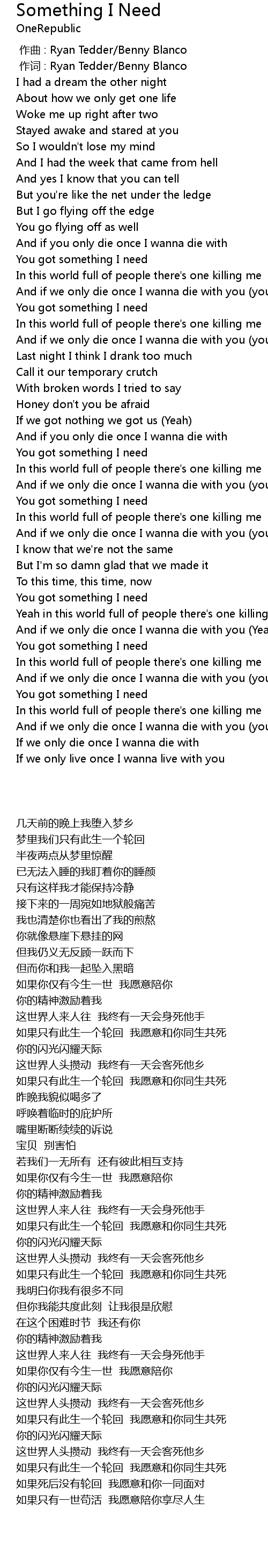 | [00:00.00] | 作曲 : Ryan Tedder/Benny Blanco |