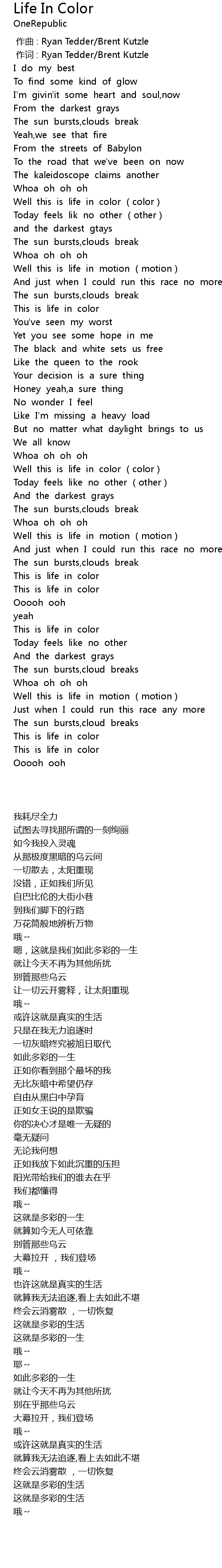 | [00:01.00] | 作词 : Ryan Tedder/Brent Kutzle |