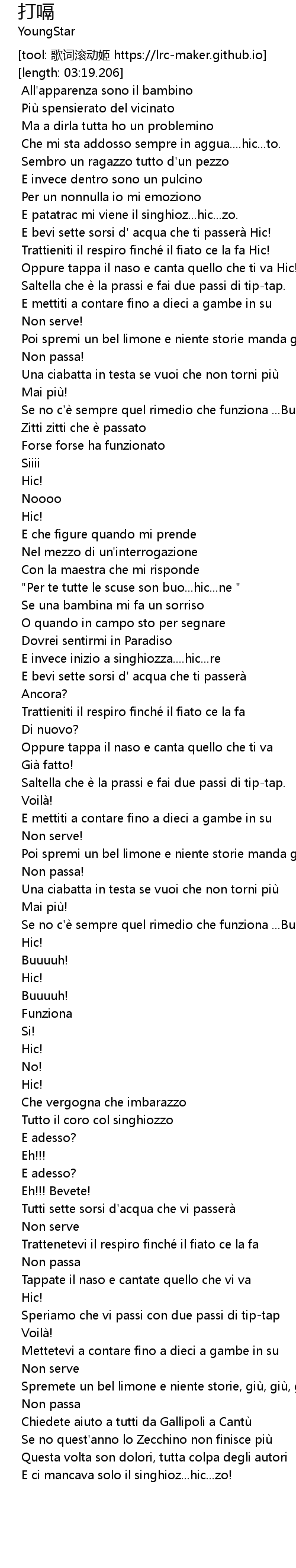 | [00:35.478] | E patatrac mi viene il singhioz... hic... zo. |