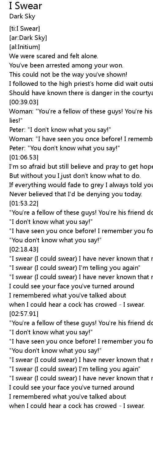 | [04:56.88] | "I swear (I could swear) I'm telling you again" |