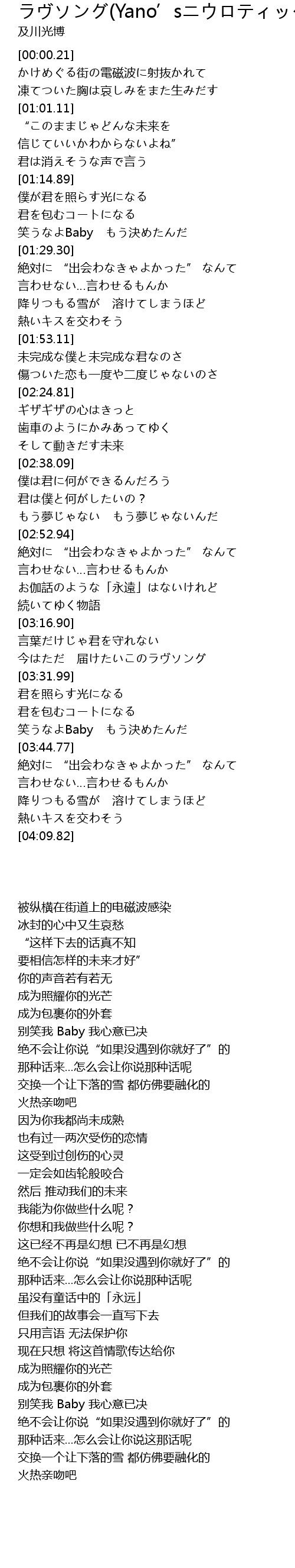| [00:47.19] | かけめぐる街の電磁波に射抜かれて |