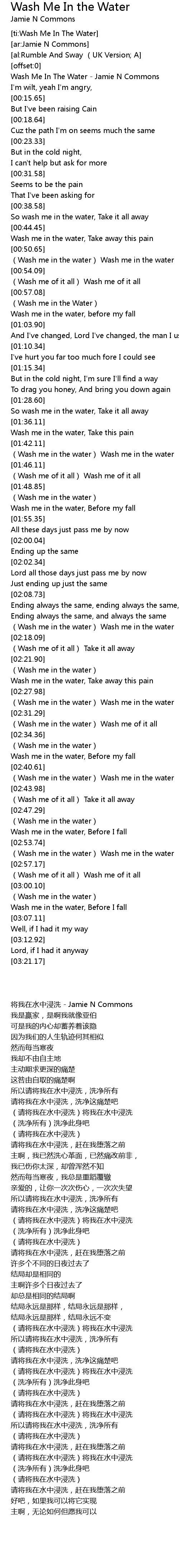 | [00:00.32] | Wash Me In The Water - Jamie N Commons |