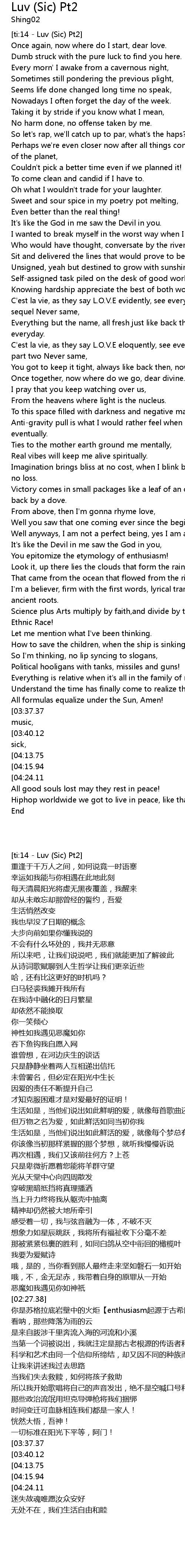 | [03:27.26][03:37.37][04:08.41][04:18.83] | The rhymes will heal ' cause I believe in music, |