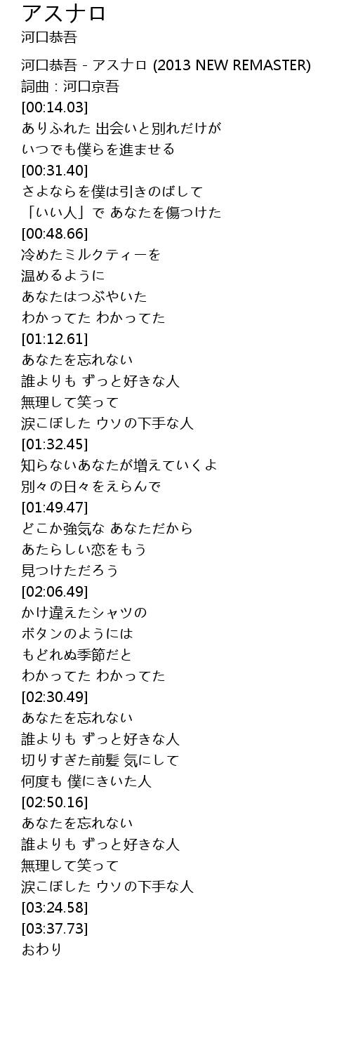 | [00:00.49] | 河口恭吾 - アスナロ (2013 NEW REMASTER) |