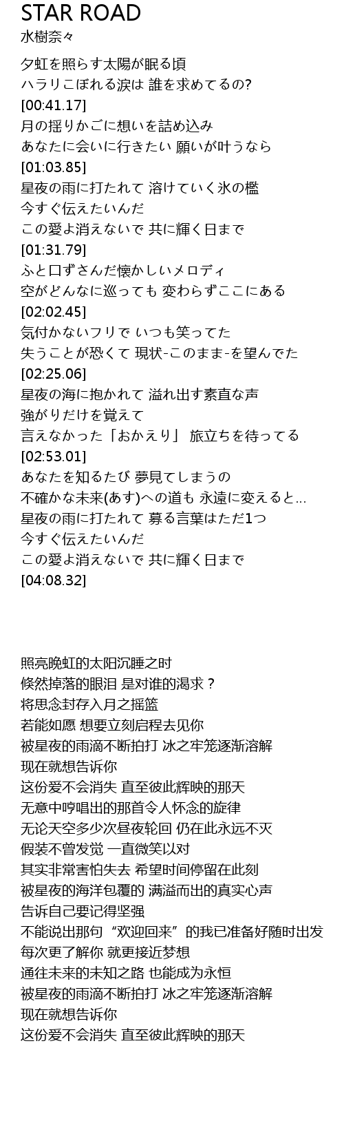 | [02:25.51] | 星夜の海に抱かれて 溢れ出す素直な声 |