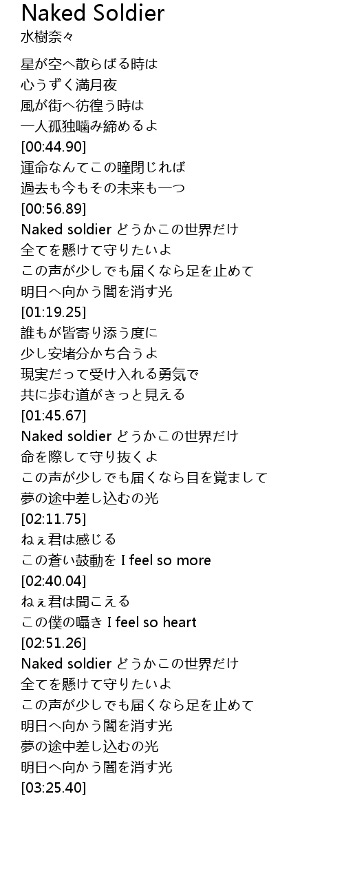 | [00:57.16] | Naked soldier どうかこの世界だけ |
