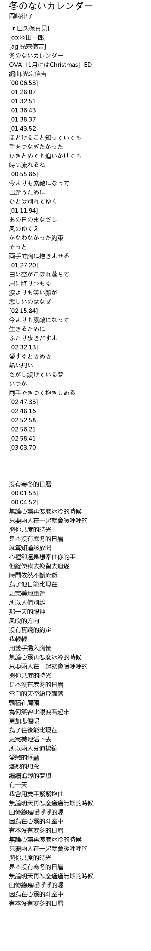 | [03:48.56][02:58.41] | 冬のないカレンダー |