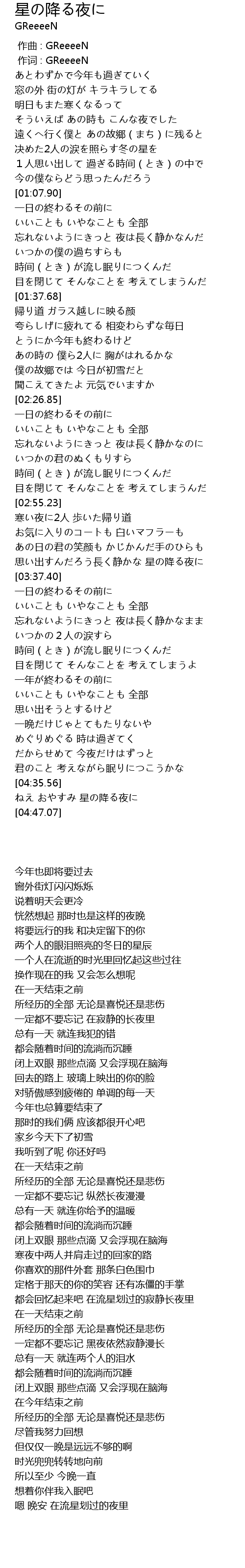 | [04:37.38] | ねえ おやすみ 星の降る夜に |