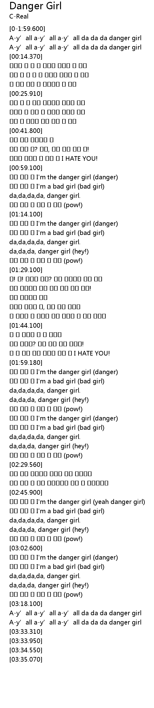 | [03:18.740] | Ay' all ay' all ay' all da da da danger girl |