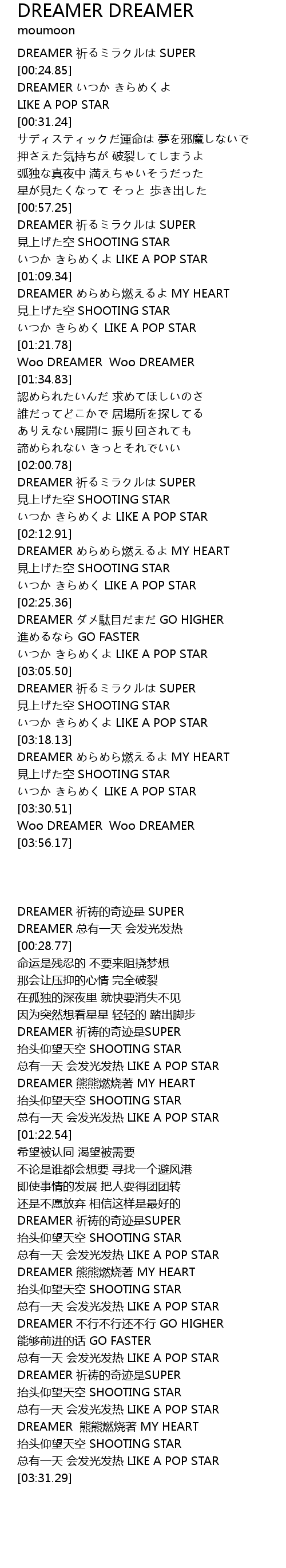 | [00:19.65] | DREAMER 祈るミラクルは SUPER |