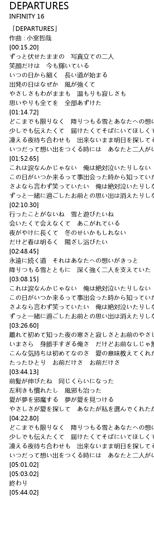 | [04:23.48] | どこまでも限りなく 降りつもる雪とあなたへの想い |