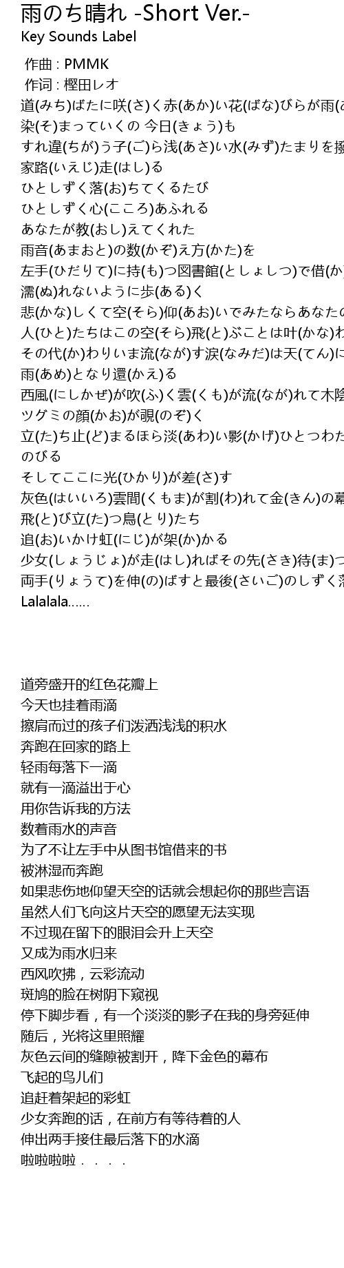 | [00:23.35] | すれ違(ちが)う子(ご)ら浅(あさ)い水(みず)たまりを撥(は)ね |