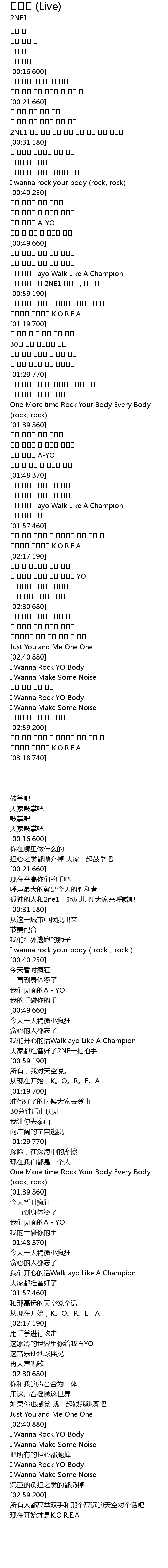 | [00:57.690] | 모두 준비 됐어 2NE1 박수 쳐, 박수 쳐 |