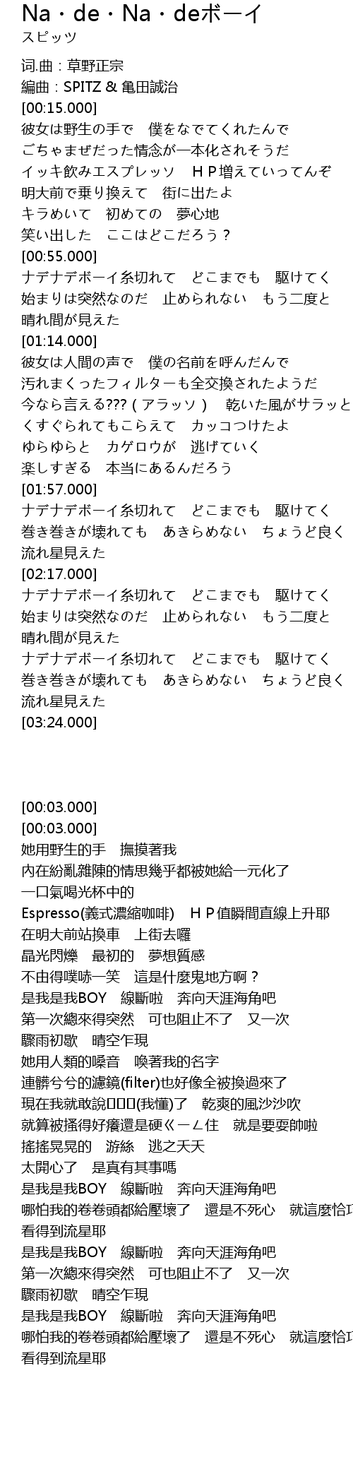 | [03:08.800] | ナデナデボーイ糸切れて どこまでも 駆けてく |