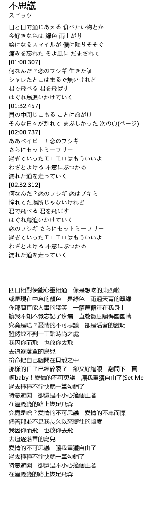 | [03:02.571] | 何なんだ?恋のフシギ 恋はブキミ |