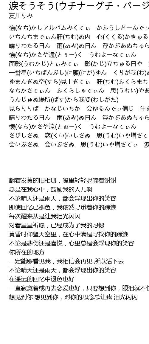 | [03:42.52] | 会いぶさぬ 会いぶさぬ 思(うむ)いや増さてぃ 涙そうそう |