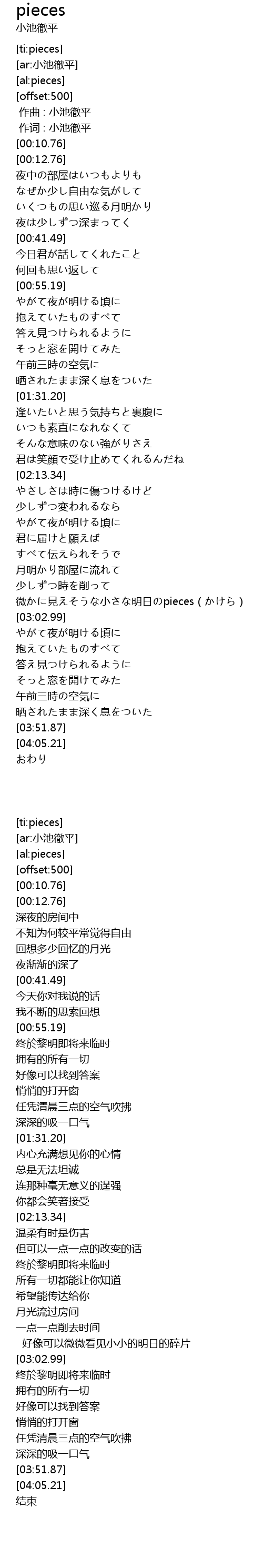 | [02:52.77] | wēi jiàn xiǎo míng rì pieces |